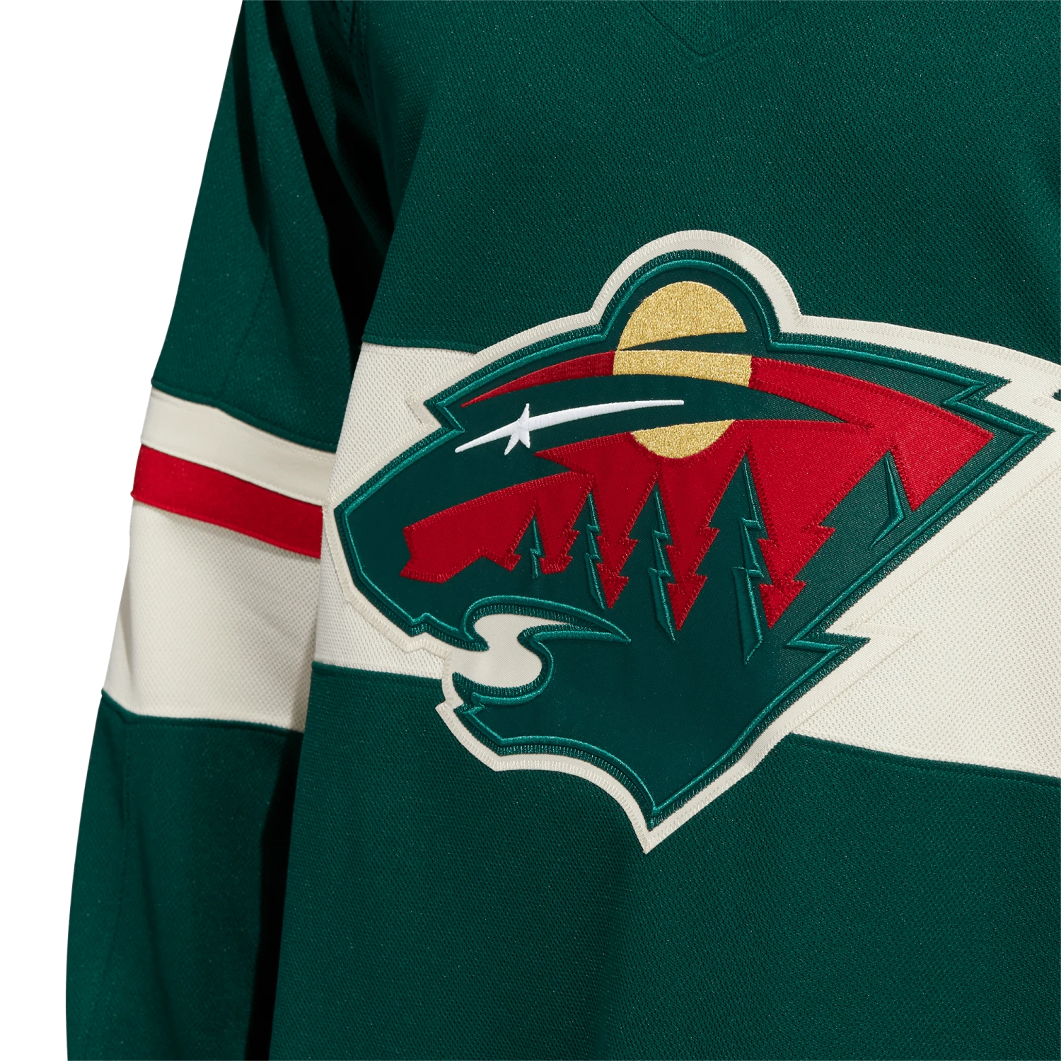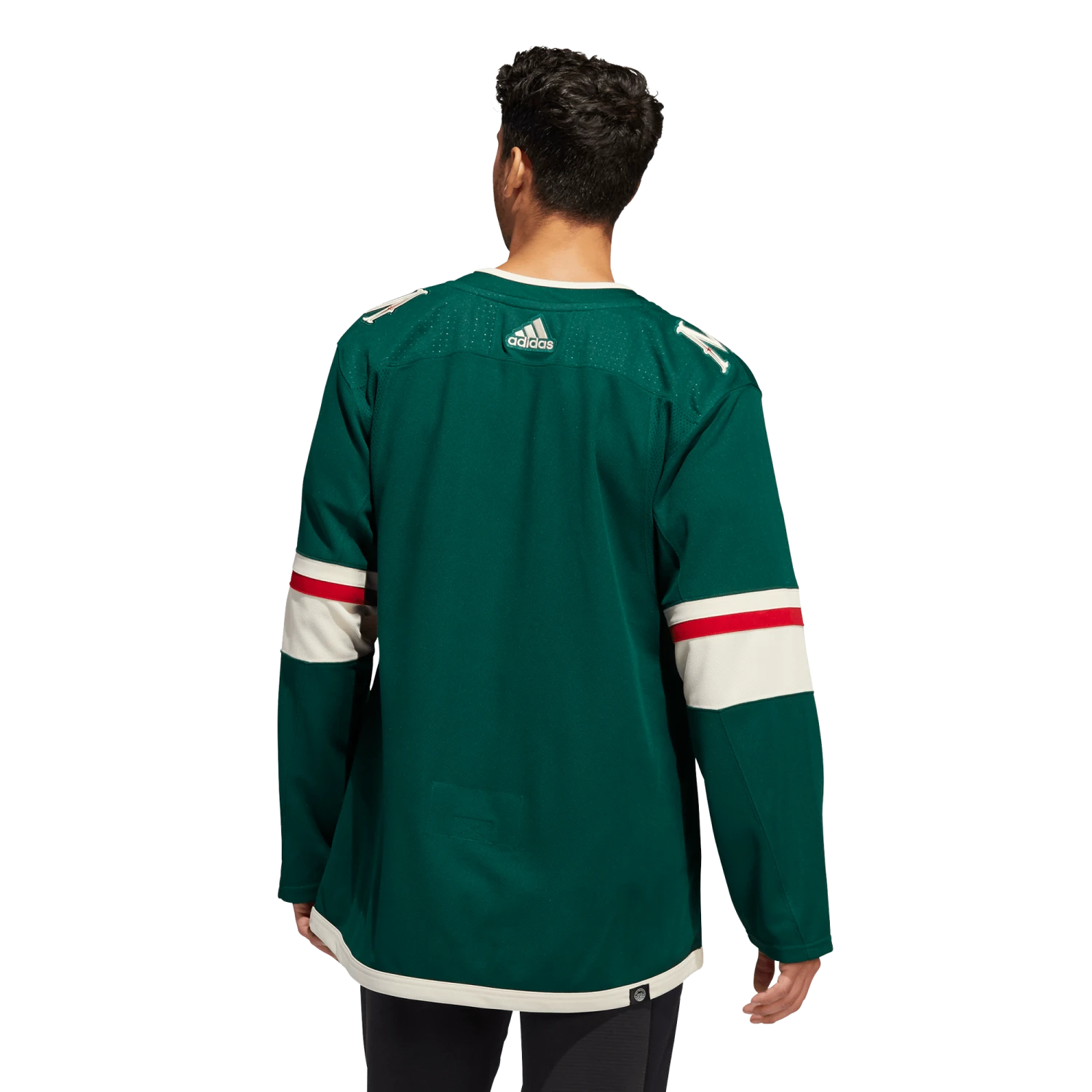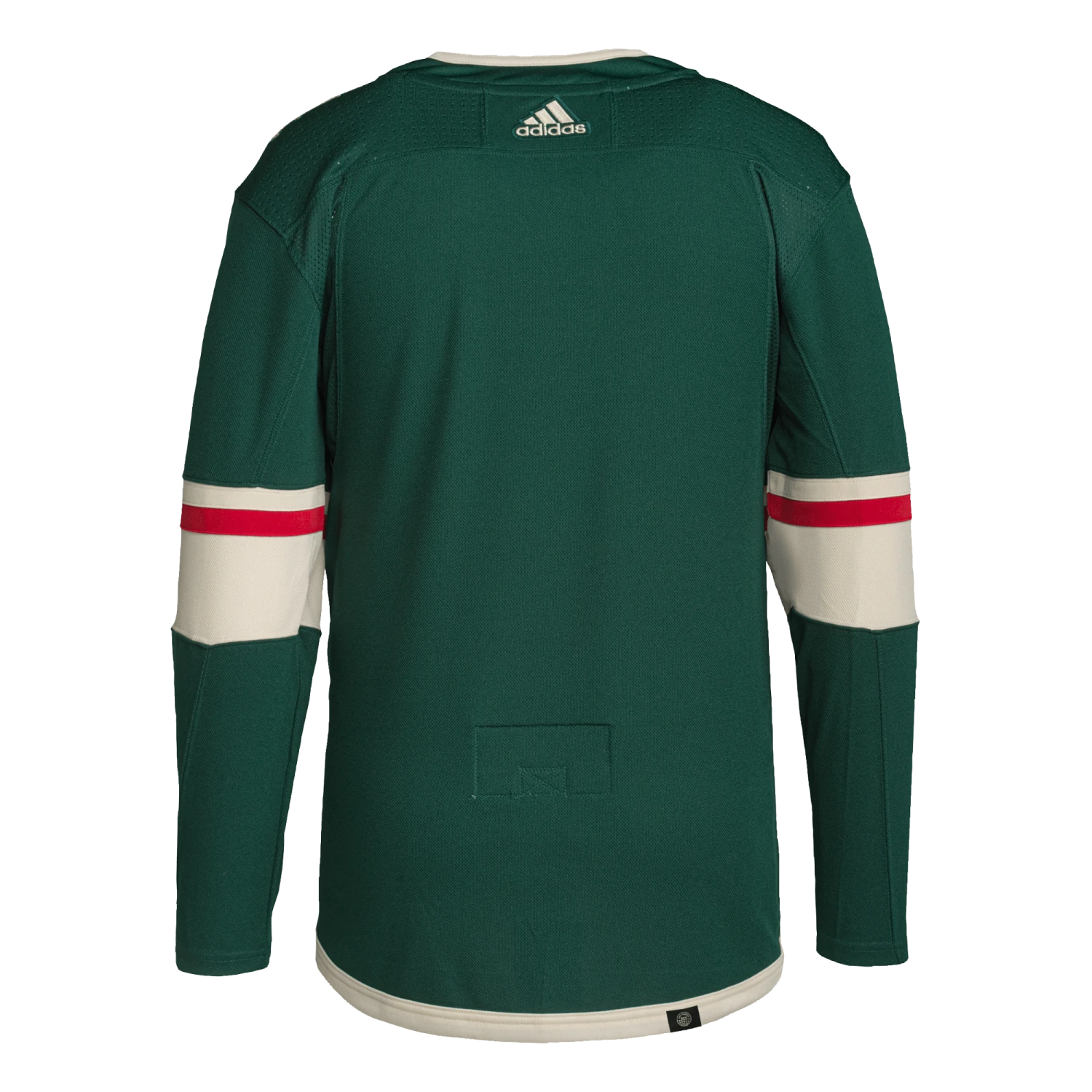 Pull on this adidas Minnesota Wild authentic home jersey, and get the gang together for game night in your fan cave. AEROREADY keeps you cool and dry as you wait for the puck to drop at center ice. The big crest out front, shoulder patches and a fight strap with a snap closure keep the look legit. This product is made with Primegreen, a series of high-performance recycled materials.
